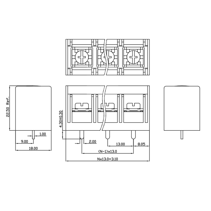 单层栅栏端子台, 标称工作电流: 40 A, 额定电压(III/2): 600 V, 额定横截面: 18-10AWG, 电位数: 2-12, 行数: 1, 每行位数: 2-12, 产品系列:DBT40C, 针距: 13.0 mm, 接线方式: 带压片的螺钉连接, 螺钉头规格: 十字开槽, 安装: 波峰焊, 导线/PCB连接方向: 0 °, 颜色: 黑色, 针脚排列: 直线排列, 焊针[P]: 3.8 mm, 每个电势的焊针数量: 1, 包装类型: 纸箱包装