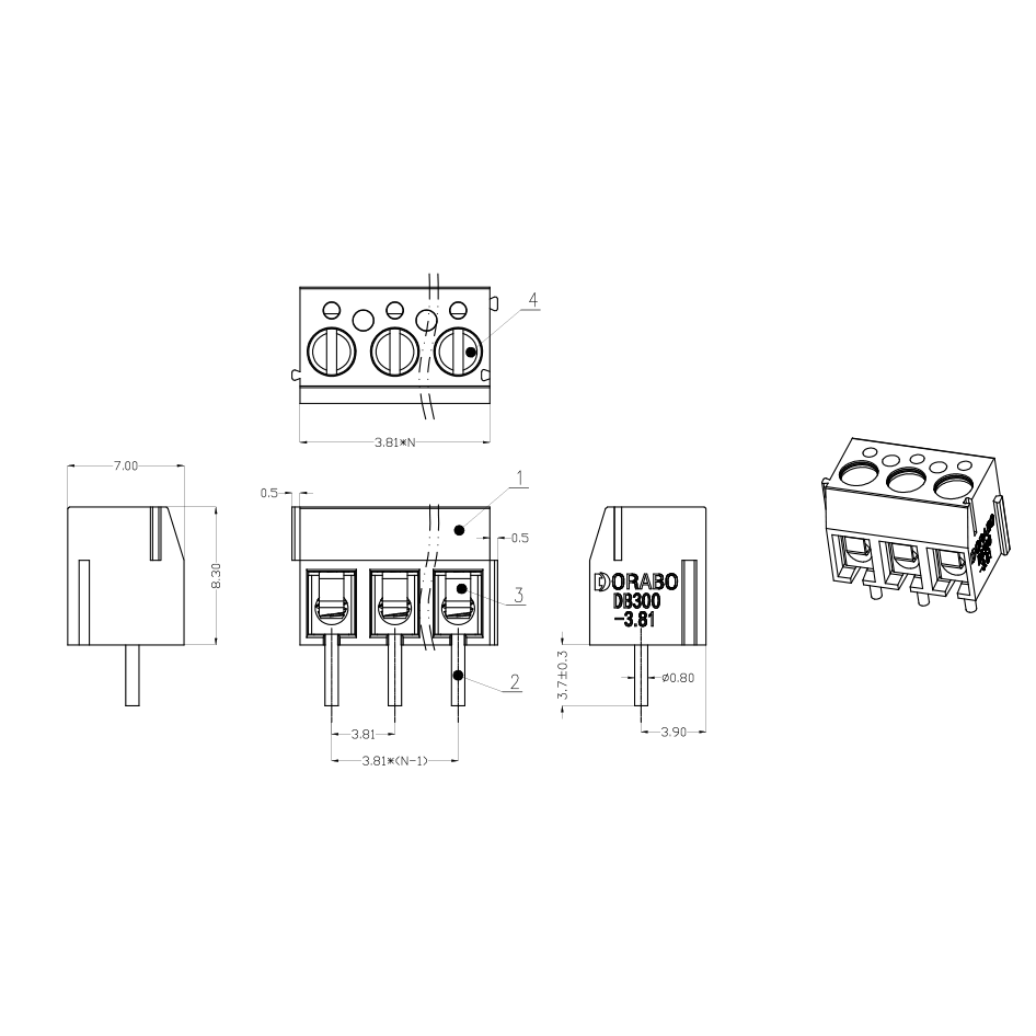 固定式连接器, 额定电流: 10 A, 额定电压(III/2): 130 V, 额定横截面: 1 mm2, 电位数: 2-24, 行数: 1, 每行位数: 2-24, 产品系列: DB300V, 针距: 3.81 mm, 接线方式: 带导线保护装置的螺钉连接, 安装: 波峰焊, 导线/PCB连接方向: 0 °, 颜色: 绿色, 针脚排列: 直线排列, 焊针[P]: 3.5 mm, 每个电势的焊针数量: 1, 包装类型: 纸箱包装