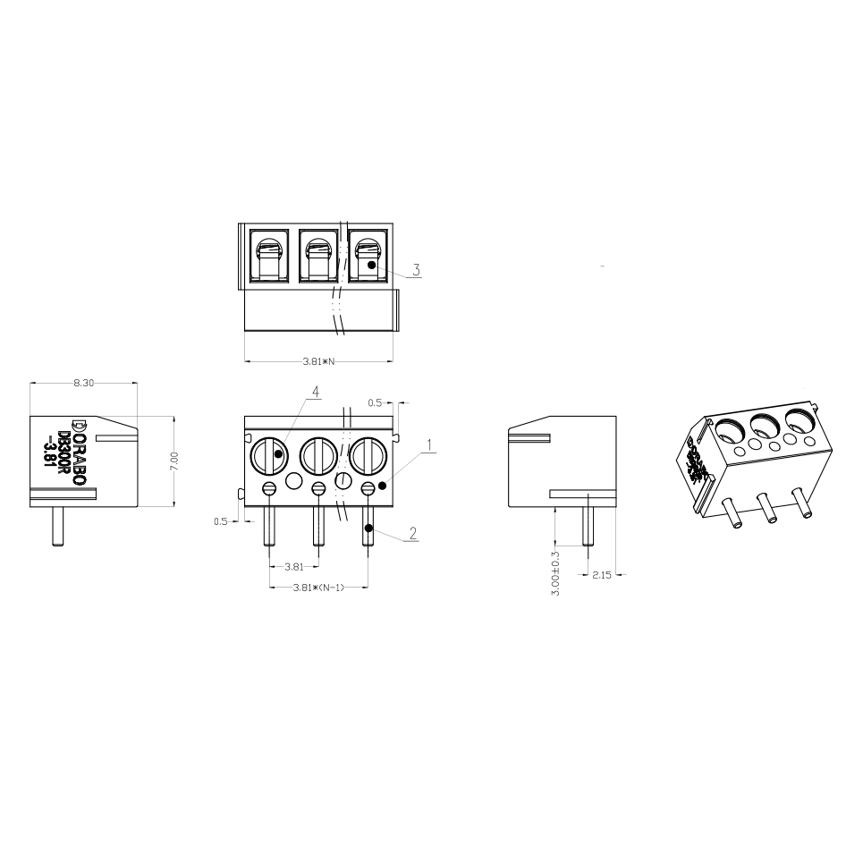 固定式连接器, 额定电流: 10 A, 额定电压(III/2): 130 V, 额定横截面: 1 mm2, 电位数: 2-24, 行数: 1, 每行位数: 2-24, 产品系列: DB300R, 针距: 3.81 mm, 接线方式: 带导线保护装置的螺钉连接, 安装: 波峰焊, 导线/PCB连接方向: 90 °, 颜色: 绿色, 针脚排列: 直线排列, 焊针[P]: 3.5 mm, 每个电势的焊针数量: 1, 包装类型: 纸箱包装